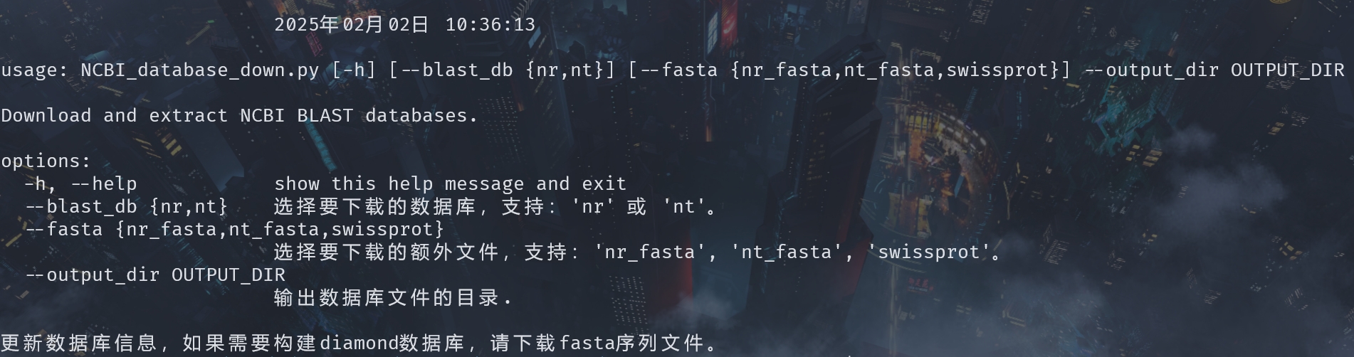 python ./NCBI_database_down.py --fasta nt_fasta -o nt_dbEmail me with more questions! 584338215@qq.com