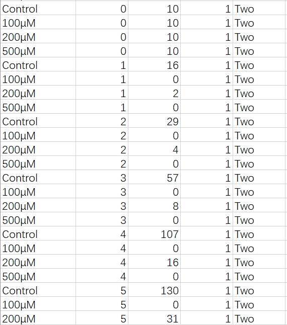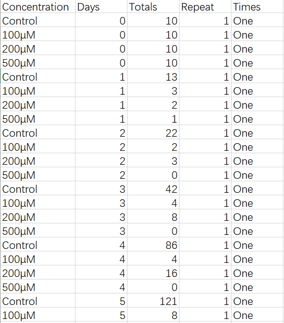 Concentration: Different concentrations of drugs.Days: Time after adding drugs.Totals: Every day’s total number of surviving individual.Repeat: Number of replicates for each drug concentration.Times: The number of repetitions of the entire experimental procedure.