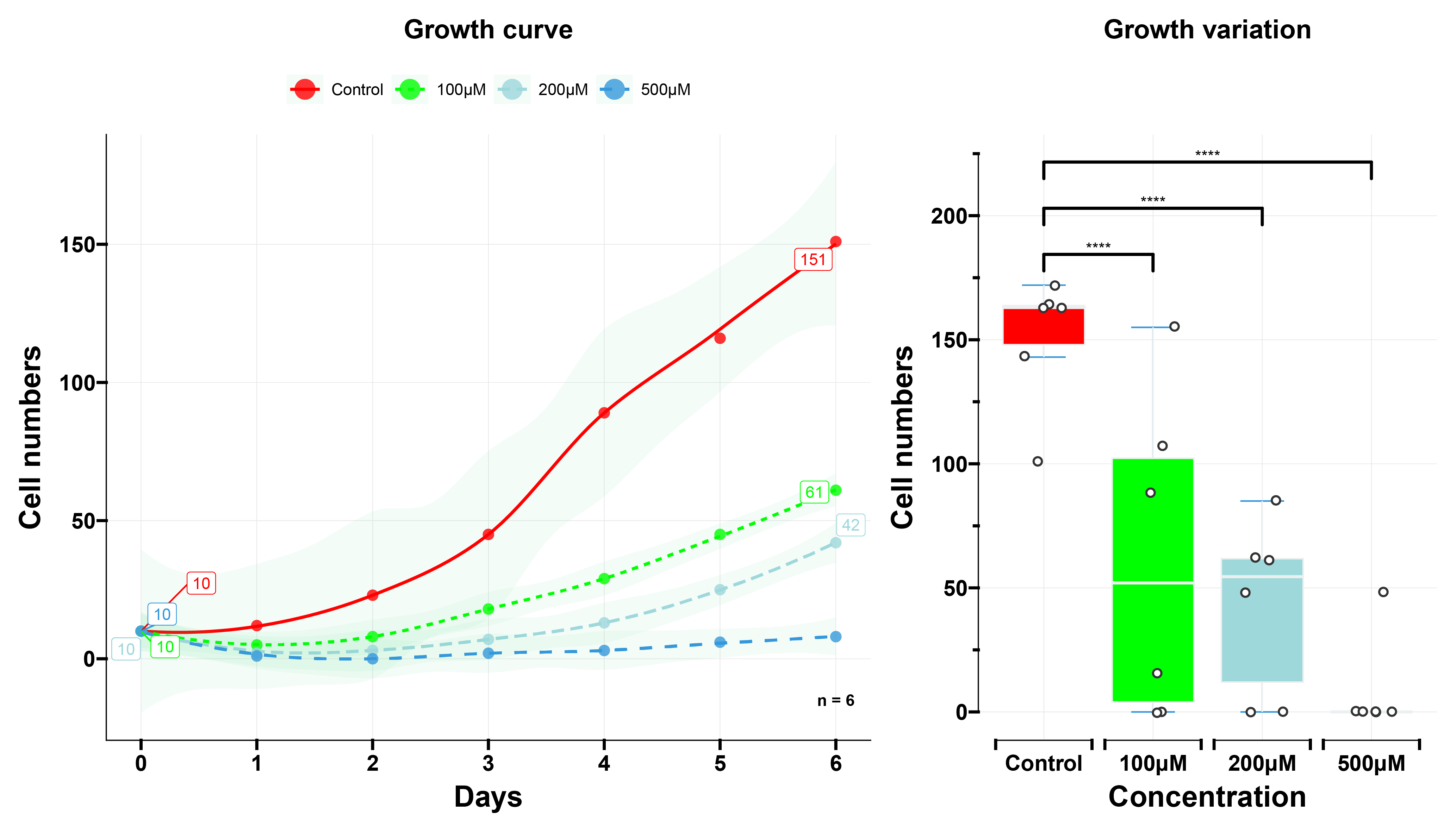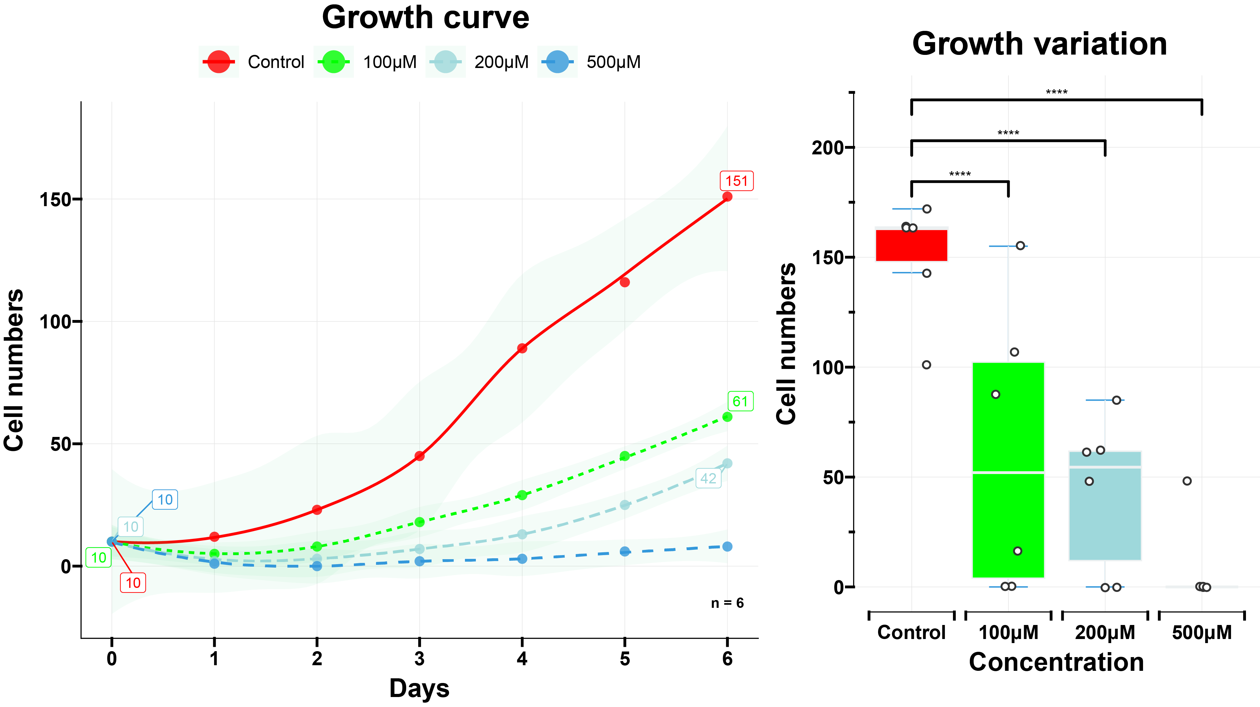 create_plots(DFMO, c("Control", "100μM", "200μM", "500μM"), file_name_prefix = "DFMO", step_increase = .1, titles = "DFMO treatment", plot_class = "smooth_box")Plotted results:
