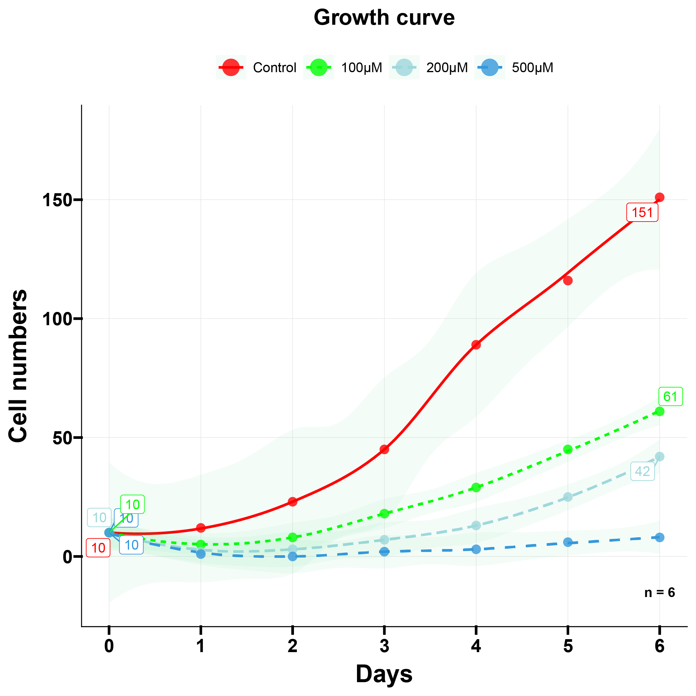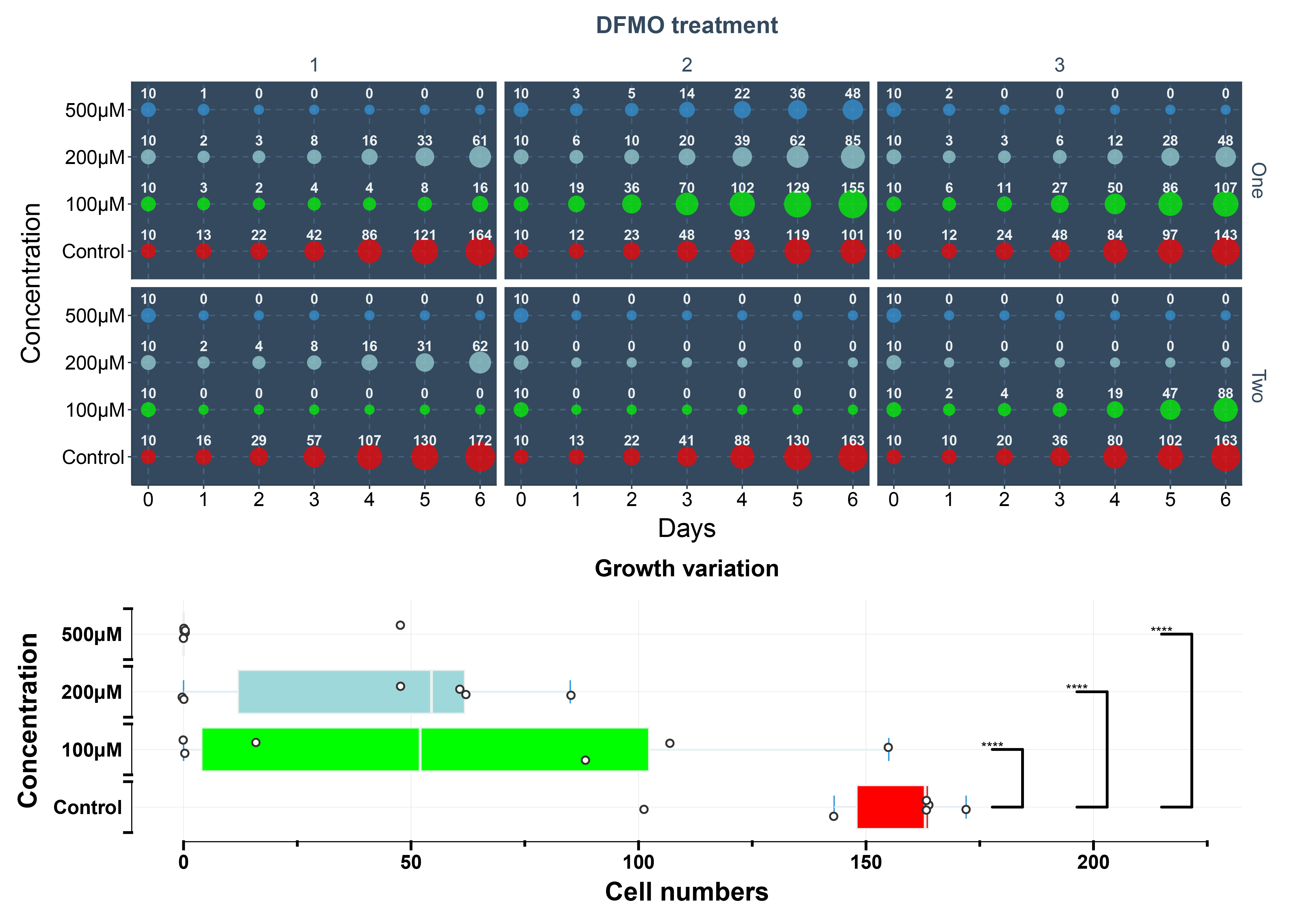 create_plots(DFMO, c("Control", "100μM", "200μM", "500μM"), file_name_prefix = "DFMO_mod", step_increase = .1, titles = "DFMO treatment", plot_class = "bubble_smooth_box")Plotted results: